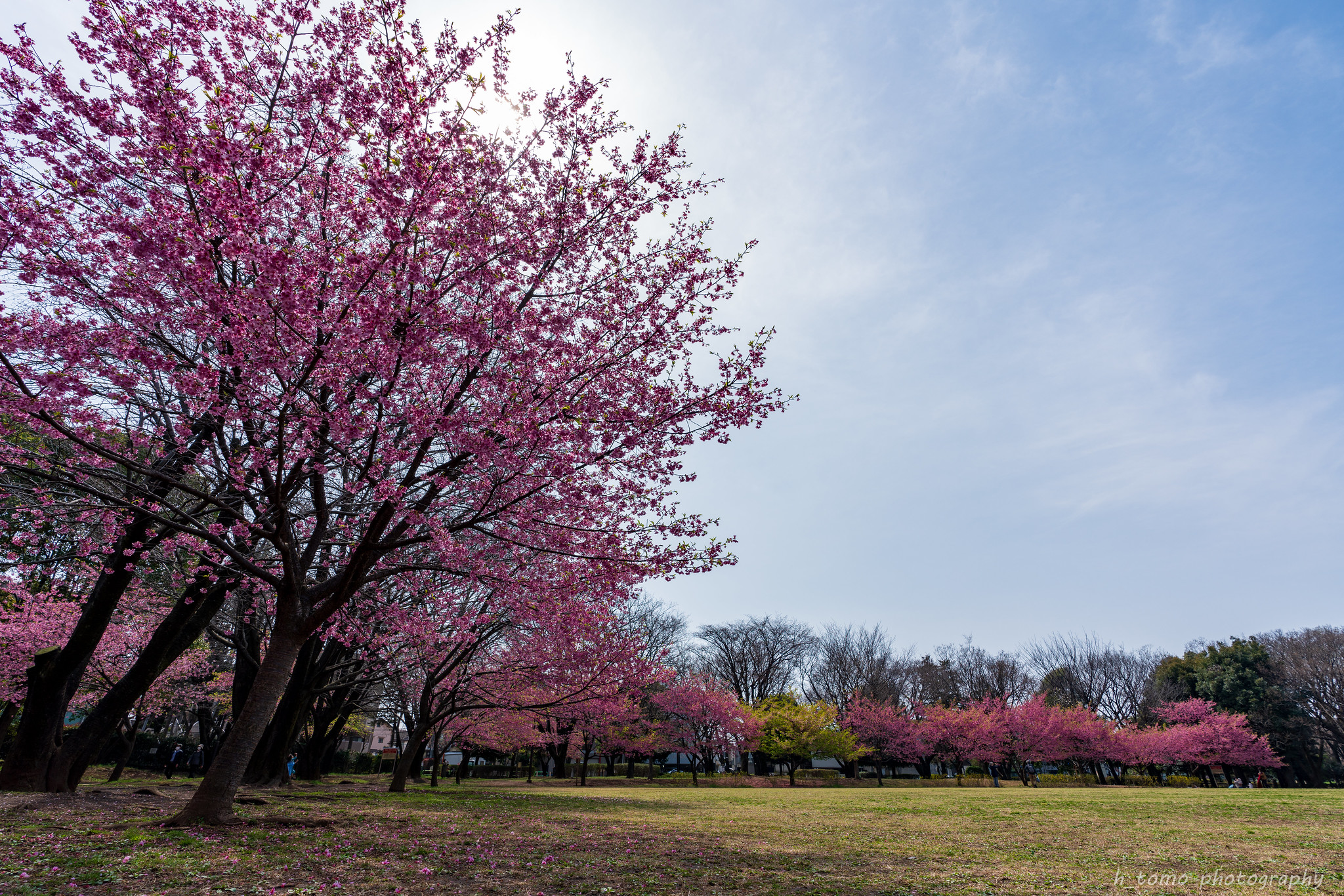 2022-03-28 河津桜 桜 公園 SONY α7RⅢ FE 16-35mm F2.8 GM 大泉さくら運動公園(東京都練馬区) 都内の桜は急に満開になりました。その中で早咲きの河津桜も葉桜のところもありますがまだまだ散らず。